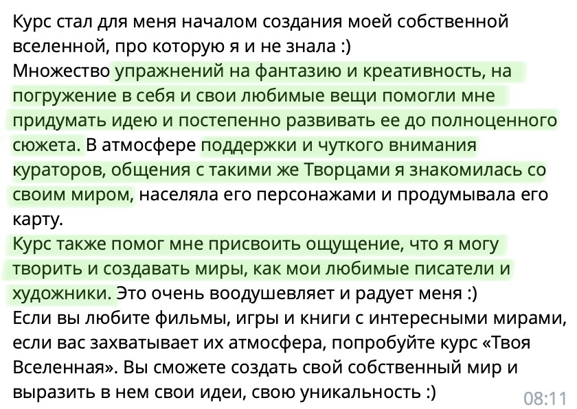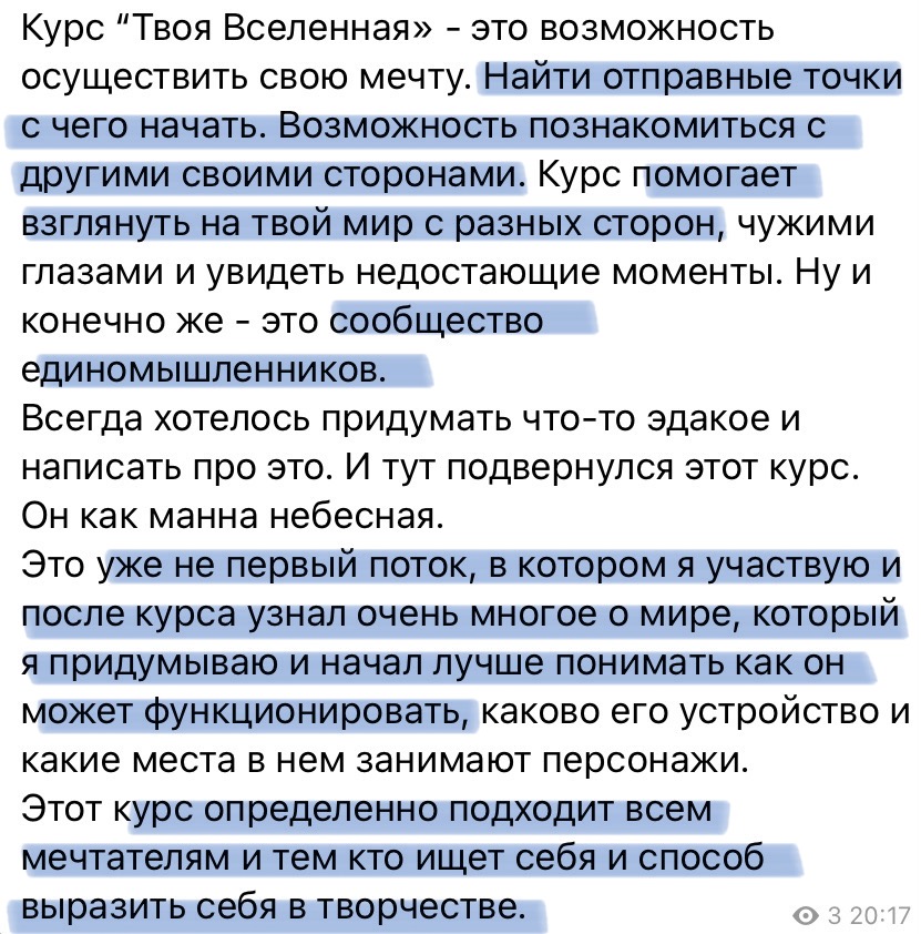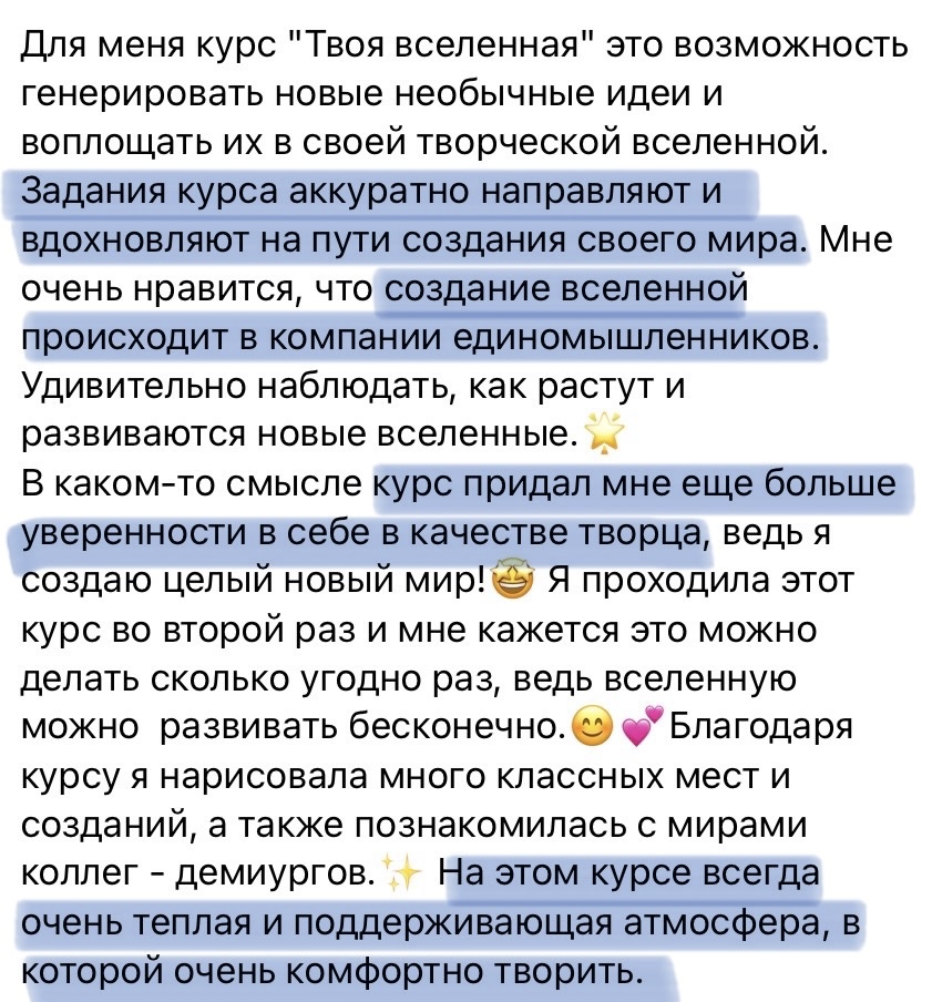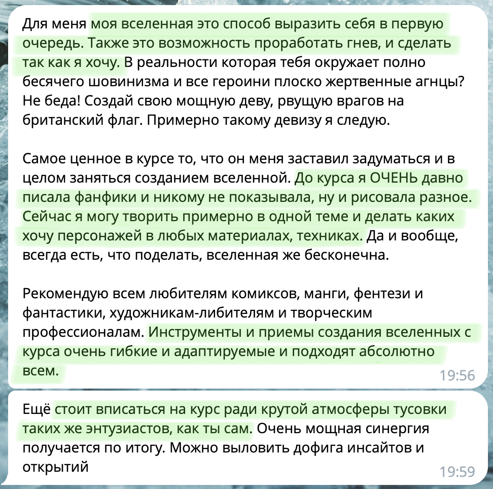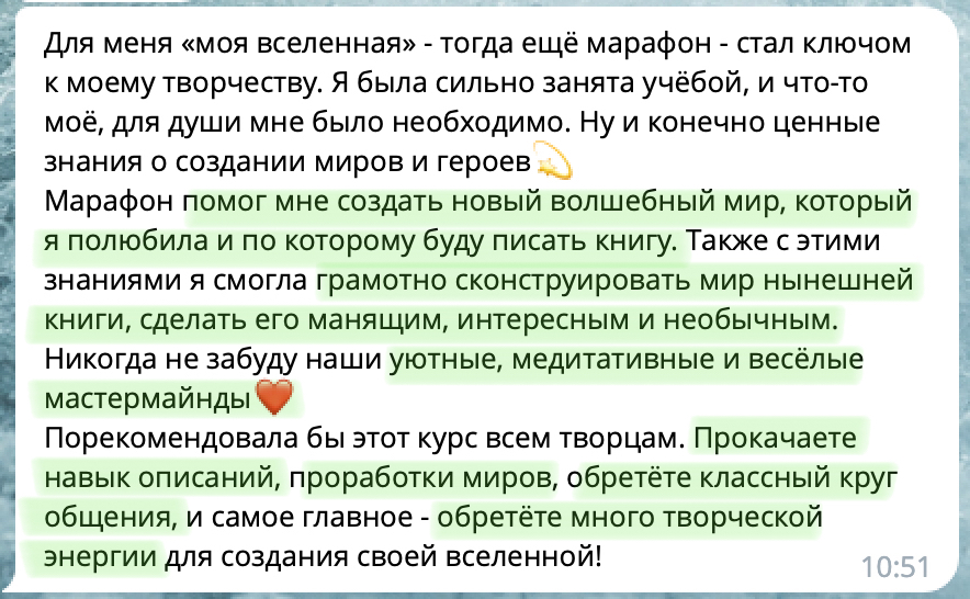 На курсе окружу вас заботой, задам наводящие вопросы, помогу сделать ваш мир действительно живым и самобытным. Щедро поделюсь своими методами генерации идей и создания разных элементов нового мира, а в конце помогу собрать все воедино в цельный проект.